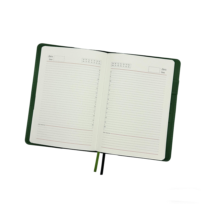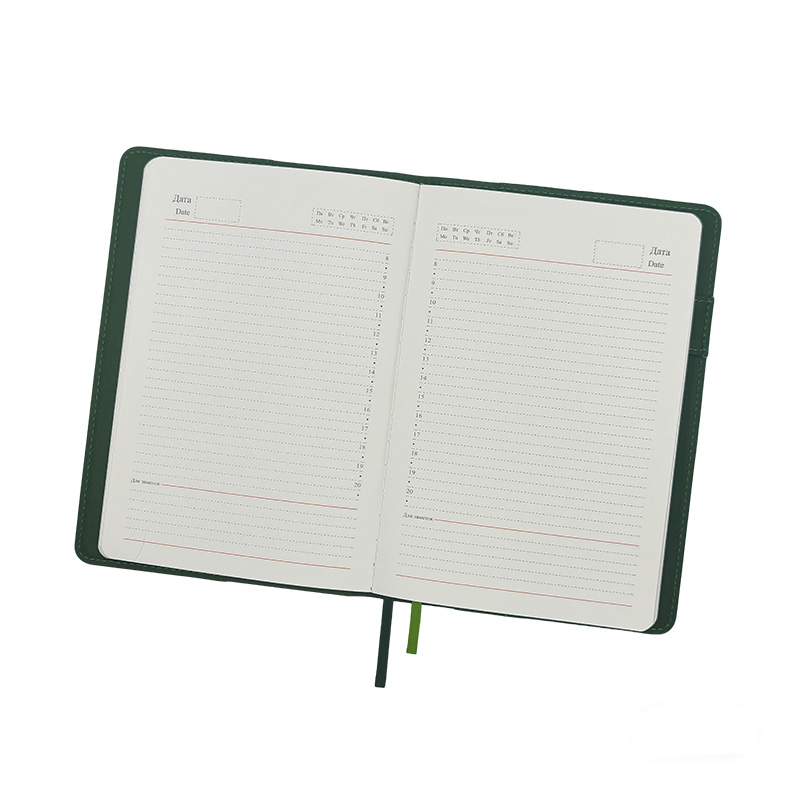 Dobbeltbåndsbogmærker: Dobbeltbåndsbogmærker i kontrasterende nuancer af hunter og mosgrøn giver mulighed for nem sidemarkering, hvilket forbedrer brugervenligheden.