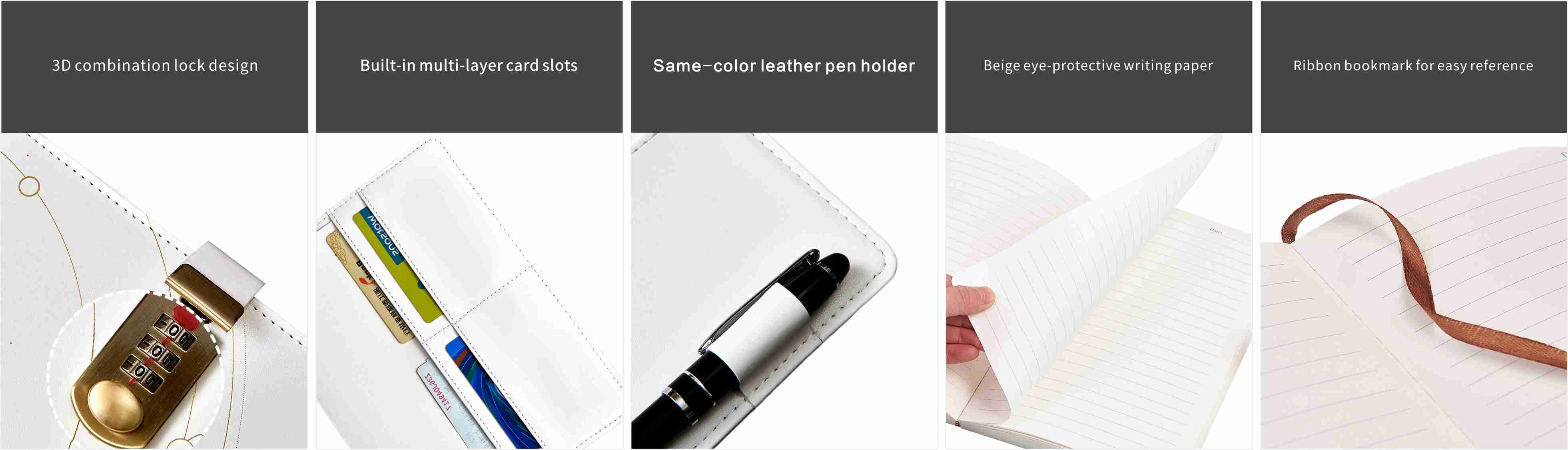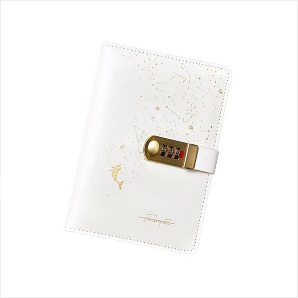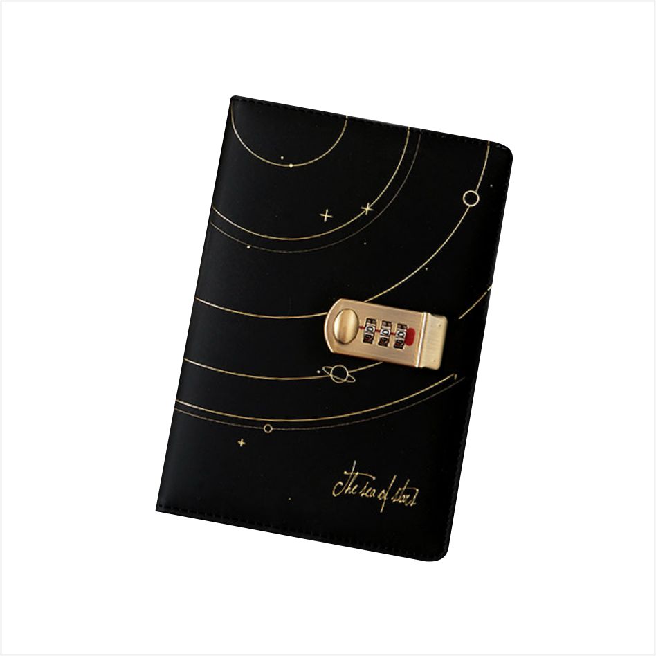 Omslaget til denne dagbog med nøgle er lavet af udsøgt forgyldt teknologi, som skitserer en bane, der ligner en planetarisk bane med enkle linjer, prikket med små prikker som stjerner, som om den fortætter den mystiske nattehimmel ind i billedet, stille og fuld af fantasi. Den er udstyret med en gylden metal kombinationslås, som styres af en trecifret adgangskode. Du kan indstille din egen adgangskode for at sikre, at kun du kan åbne indholdet.