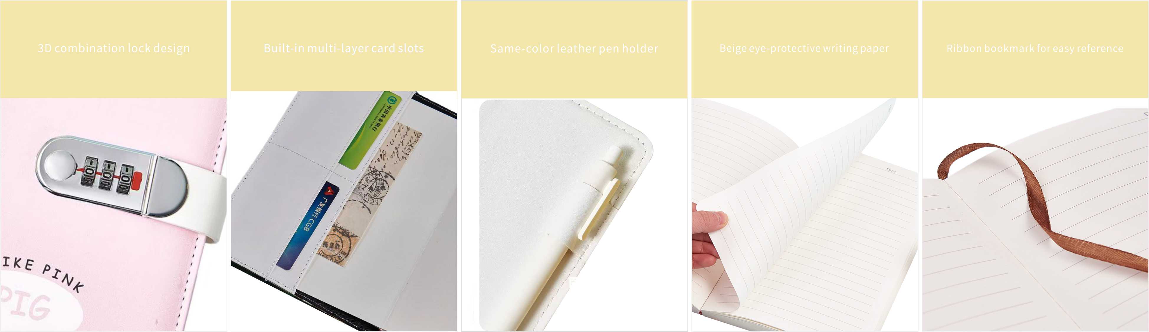 Denne dagbog med adgangskodelås giver en række søde dækningsmønstre. Uanset hvilken stil du kan lide, kan du finde dit yndlingsvalg her. Det er også udstyret med en robust og holdbar metaladgangskodelås. Du kan indstille en unik adgangskode selv for at sikre, at kun du kan åbne den og læse den indre side, hvilket giver pålidelig beskyttelse af dit privatliv og vigtige oplysninger. For at gøre det praktisk for dig at optage dine ideer når som helst, sætter vores dagbog også en omhyggeligt en penposition. Det kan holde pennen støt, så du kan tage en penrekord når som helst, når du har brug for den. Et andet fremtrædende træk er dens indre taskefunktion. Denne dagbog med adgangskodelås er udstyret med flere kortstik og indre lommer, som giver dig mulighed for pænt at gemme bankkort, ID -kort, medlemskort, kvitteringer og andre genstande, og du behøver ikke længere at bekymre dig om at miste disse vigtige varer.