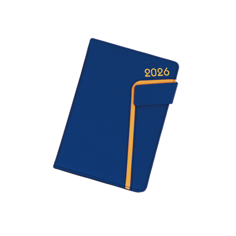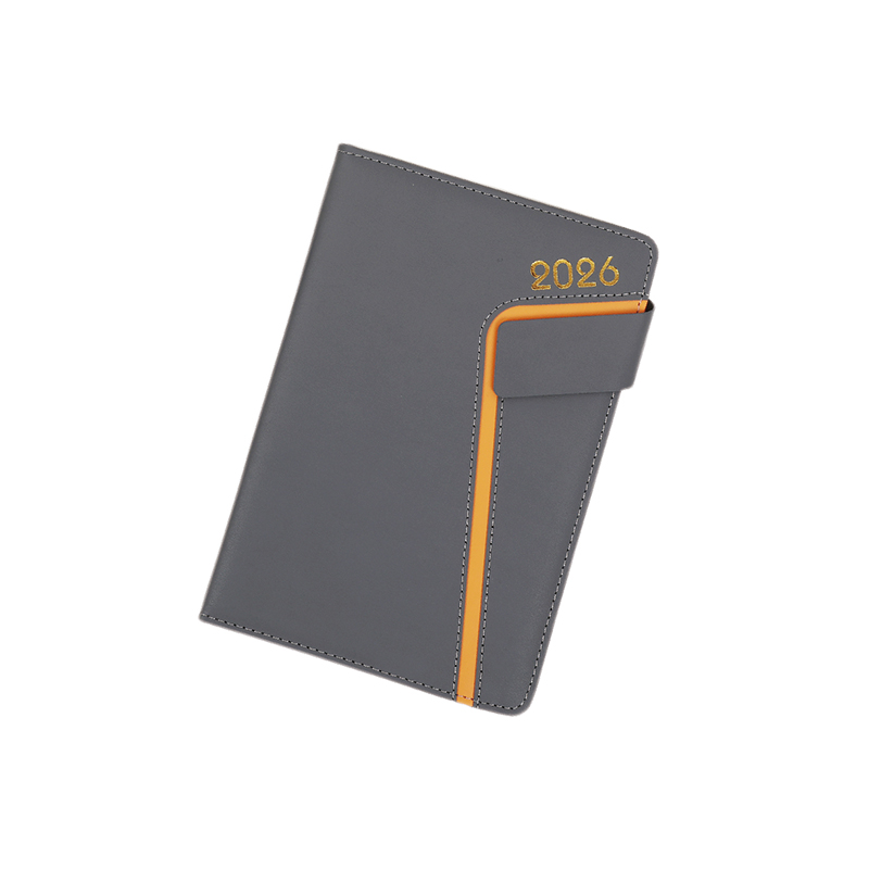 Denne tyske notebook har et PU-læderafdækning med en delikat struktur, et guldbelagt 2026-logo og en lys orange linje på siden, parret med en magnetisk spænde af samme farve, til et enkelt og unikt design.