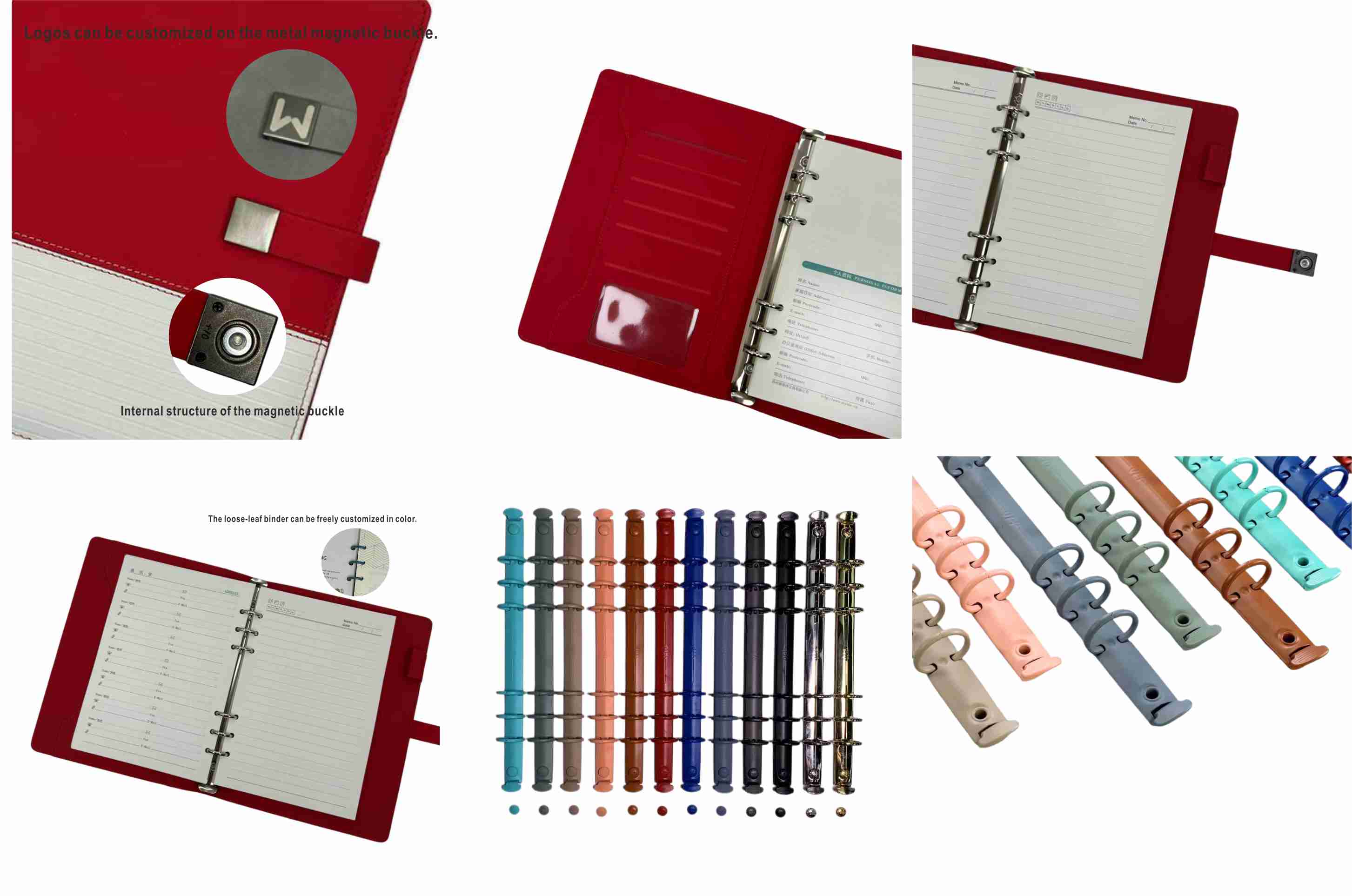 Der er mange farver at vælge imellem i bindemidlet. Det klassiske guld forbedrer følelsen af sofistikering, som er velegnet til forretningsforhandlinger og vigtige møder. Rolig sort, frisk blå, levende orange og andre farver kan frit matches i henhold til personlige præferencer og dækningsstil. Det understøtter endda tilpassede farver, så bindemidlet passer perfekt til dine æstetik- og brugsscenarier, hvilket skaber et unikt notesbogsudseende. Foruden praktisk har det også mere personlig tilpasning af logo, der skiller sig ud fra mange almindelige notesbøger.